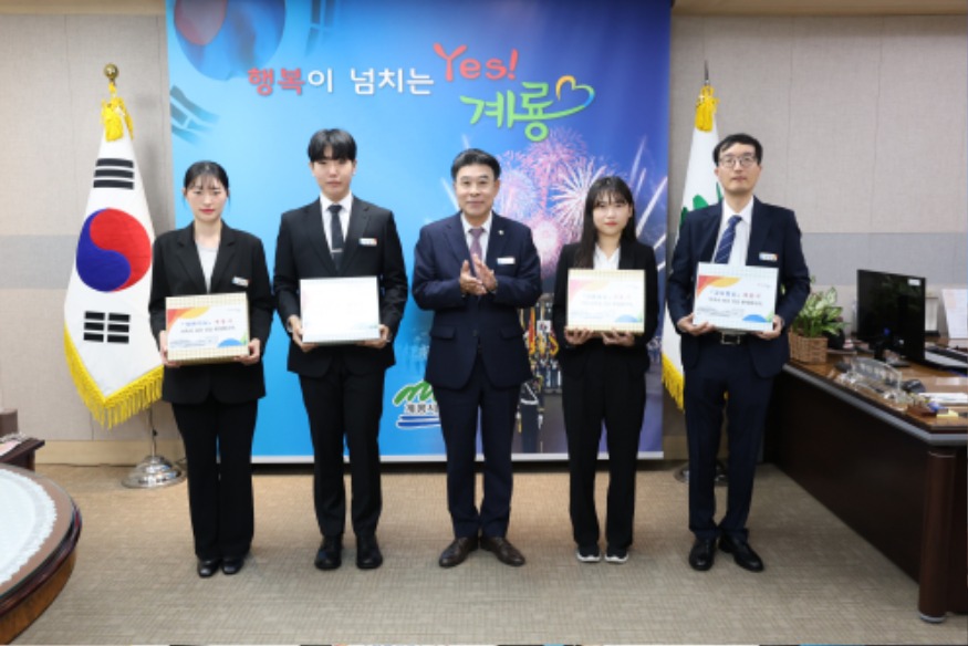 [ÃæÃ»ÇÖÀ̽´] °è·æ½Ã(½ÃÀå ÀÌÀÀ¿ì)´Â 14ÀÏ ½ÃÀå Áý¹«½Ç¿¡¼ ½Å±ÔÀÓ¿ë °øÁ÷ÀÚ 4¸í¿¡°Ô ÀÓ¿ëÀåÀ» ¼ö¿©Çϰí, ½Ã °øÁ÷¿¡ ù ¹ßÀ» µðµò °ÍÀ» ȯ¿µÇÏ´Â Àǹ̸¦ ´ã¾Æ ¡®À£ÄÄŰƮ¡¯¸¦ Àü´ÞÇß´Ù°í ¹àÇû´Ù.