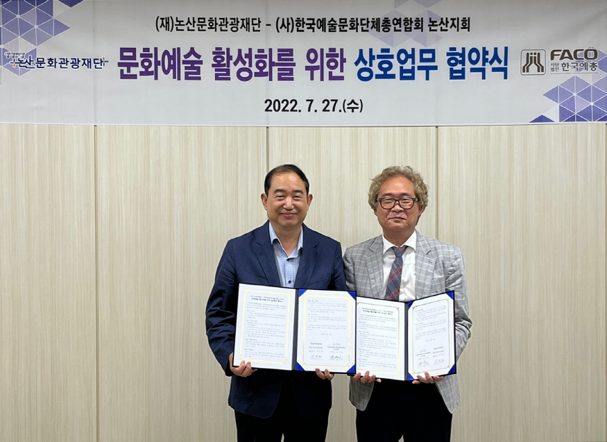 [ÃæÃ»ÇÖÀ̽´] (Àç)³í»ê¹®È°ü±¤Àç´Ü(´ëÇ¥ ÁöÁøÈ£)°ú (»ç)Çѱ¹¿¹¼ú¹®È´ÜüÃÑ¿¬ÇÕȸ ³í»êÁöȸ(ÁöȸÀå À±ÁÖ¹Î)´Â Áö³ 27ÀÏ ³í»ê¹®È°ü±¤Àç´Ü¿¡¼ ¡®¹®È¿¹¼ú ºÐ¾ß Ȱ¼ºÈ¸¦ À§ÇÑ ¾÷¹«Çù¾à¡¯À» ü°áÇß´Ù.