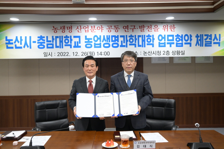[ÃæÃ»ÇÖÀ̽´] ³í»ê½Ã(¹é¼ºÇö)¿Í Ãæ³²´ëÇб³ ³ó¾÷»ý¸í°úÇдëÇÐ(ÇÐÀå ±è´ë½Ä, ÀÌÇÏ Ãæ³²´ë)ÀÌ Áö³­ 26ÀÏ ³í»ê½Ãû¿¡¼­ ¡®³ó»ý¸í »ê¾÷ºÐ¾ß ¿¬±¸¤ý¹ßÀüÀ» À§ÇÑ ¾÷¹«Çù¾à¡¯À» ü°á, ³ó¾÷ Çõ½Å¿¡ ÈûÀ» ÇÕÄ£´Ù.