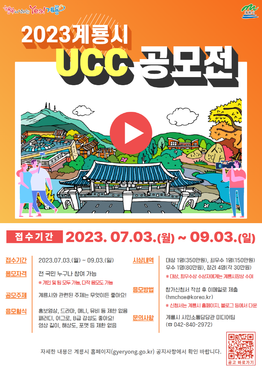 [ÃæÃ»ÇÖÀ̽´] °è·æ½Ã(½ÃÀå ÀÌÀÀ¿ì)´Â Àü±¹¹ÎÀ» ´ë»óÀ¸·Î ¡®2023 °è·æ½Ã UCC ¿µ»ó °ø¸ðÀü¡¯À» °³ÃÖÇÑ´Ù°í ¹àÇû´Ù.