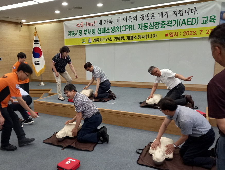 [ÃæÃ»ÇÖÀ̽´] °è·æ½Ã(½ÃÀå ÀÌÀÀ¿ì)´Â 27ÀÏ ½Ãû °£ºÎ °ø¹«¿ø 30¿© ¸íÀ» ´ë»óÀ¸·Î ½ÉÆó¼Ò»ý¼ú(CPR) ¹× ÀÚµ¿½ÉÀåÃæ°Ý±â(AED) »ç¿ë ±³À°À» ½Ç½ÃÇß´Ù°í ¹àÇû´Ù.