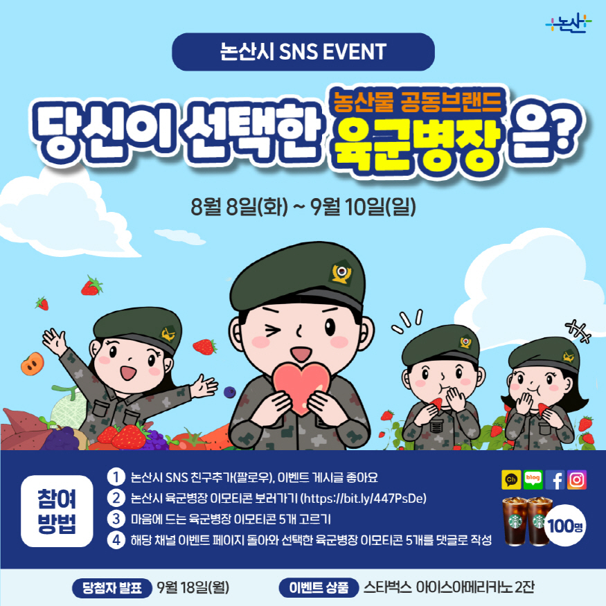 ÇÑÆí, ½Ã´Â 50Á¾ÀÇ À̸ðƼÄÜ Áß ÀÎÅÍ³Ý Æ÷ÅлçÀÌÆ®¿¡ µî·ÏÇÒ 16~24Á¾ÀÇ À̸ðƼÄÜÀ» ¼±Á¤Çϱâ À§ÇØ ½Ã¹ÎÂü¿© À̺¥Æ®¸¦ ÁøÇàÇϰí ÀÖ´Ù. īī¿ÀÅå ä³Î¤ýºí·Î±×¤ýÆäÀ̽ººÏ¤ýÀνºÅ¸±×·¥ µî ½Ã °ø½Ä SNS¿¡ ¡®´ç½ÅÀÌ ¼±ÅÃÇÑ ³ó»ê¹° °øµ¿ºê·£µå À°±ºº´ÀåÀº?¡¯À̶ó´Â À̺¥Æ®°¡ °Ô½ÃµÇ¾î ÀÖÀ¸¸ç, Âü¿© Èñ¸ÁÀÚ´Â °Ô½Ã±Û¿¡ ¡®ÁÁ¾Æ¿ä¡¯¸¦ ´©¸£°í ¸¶À½¿¡ µå´Â À̸ðƼÄÜ 5°³¸¦ ´ñ±Û·Î ÀÛ¼ºÇÏ¸é µÈ´Ù.