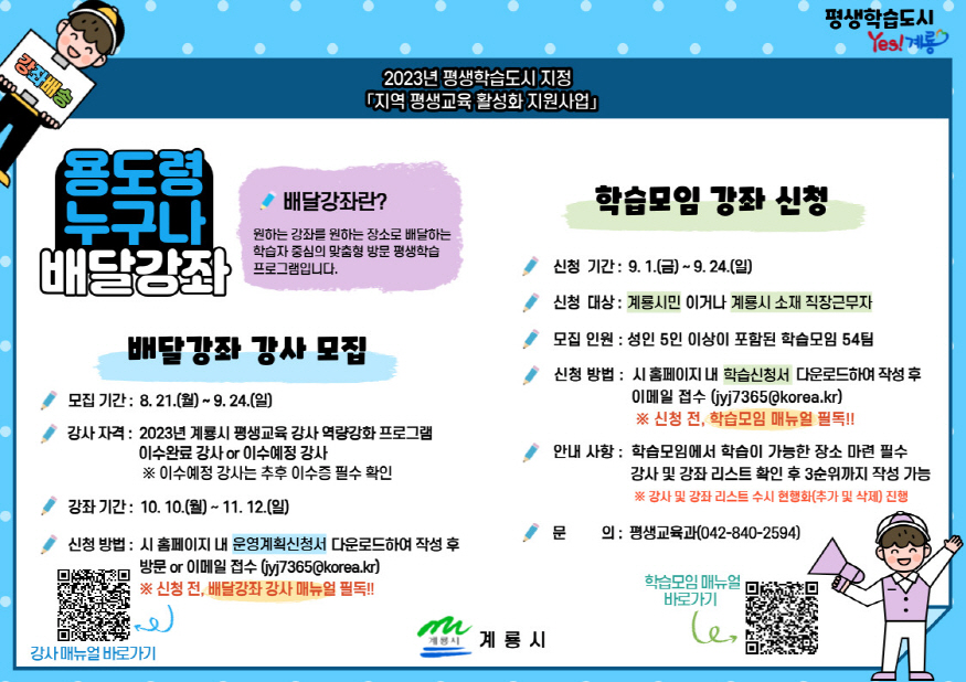 [ÃæÃ»ÇÖÀ̽´] °è·æ½Ã(½ÃÀå ÀÌÀÀ¿ì)´Â ¿À´Â 9¿ù 24ÀϱîÁö ¡®Ã£¾Æ°¡´Â ¹è´Þ°­Á¡¯ ¿î¿µÀ» À§ÇÑ °­»ç ¸ðÁý¿¡ ³ª¼±´Ù°í ¹àÇû´Ù.