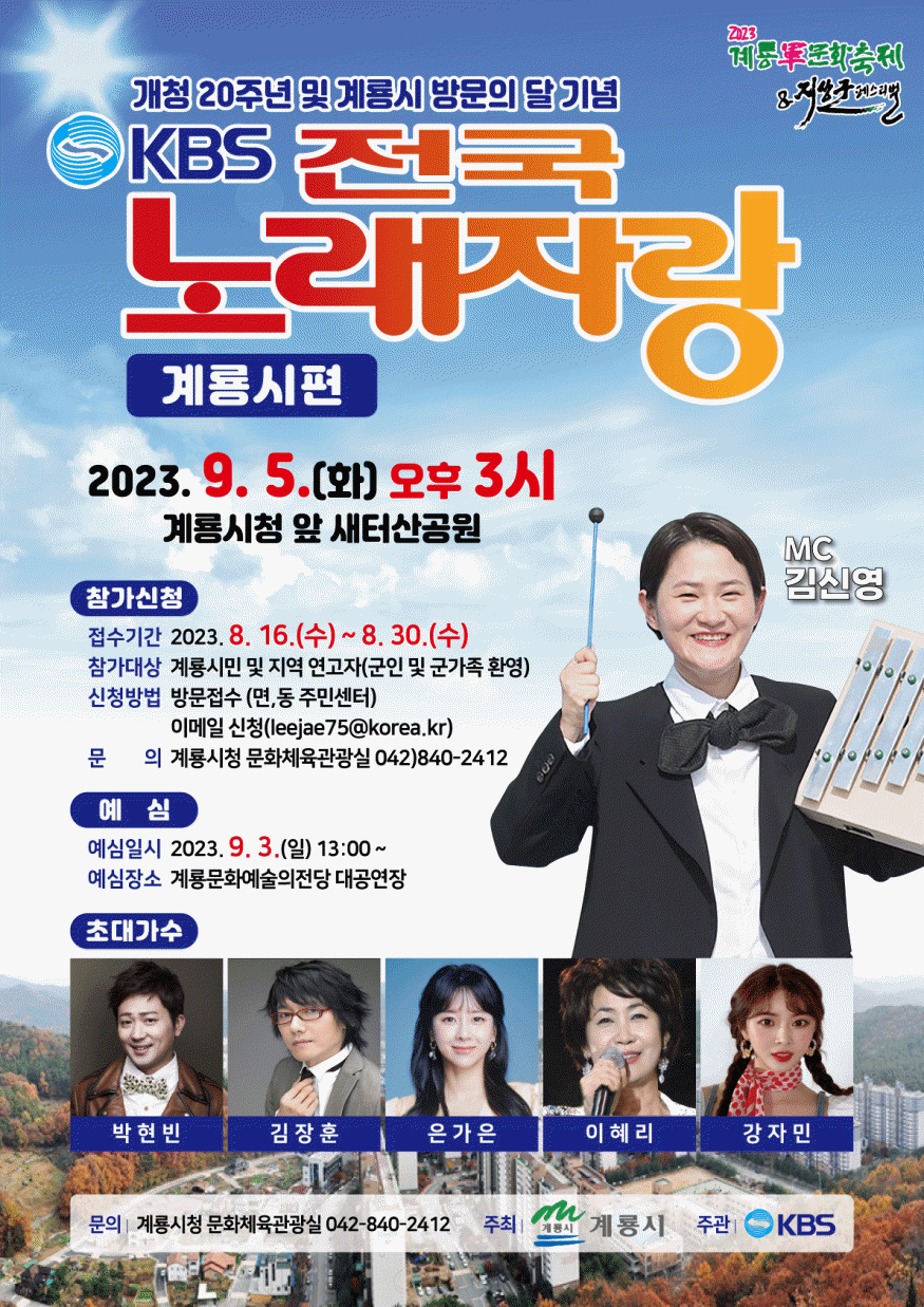 [ÃæÃ»ÇÖÀ̽´] °è·æ½Ã(½ÃÀå ÀÌÀÀ¿ì)´Â ã¼ °³Ã» 20ÁÖ³âÀ» ±â³äÇϰí, °è·æ½Ã ¹æ¹®ÀÇ ´Þ(9~10¿ù)À» Àü±¹¿¡ È«º¸Çϱâ À§ÇØ ÁøÇàµÇ´Â KBS Àü±¹³ë·¡ÀÚ¶û °è·æ½ÃÆí ¿¹½ÉÀÌ ¿À´Â 9¿ù 3ÀÏ °è·æ¹®È¿¹¼úÀÇÀü´ç ´ë°ø¿¬Àå¿¡¼ ¿ÀÈÄ 1½ÃºÎÅÍ ÁøÇàµÈ´Ù°í ÀüÇß´Ù.