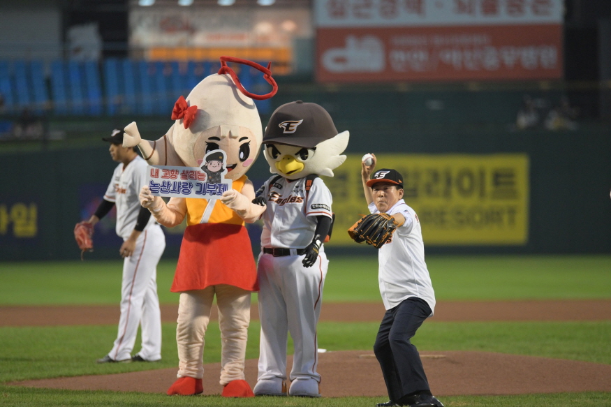 [ÃæÃ»ÇÖÀ̽´] ¹é¼ºÇö ³í»ê½ÃÀåÀÌ 19ÀÏ ´ëÀü ÇÑÈ­»ý¸íÀ̱۽ºÆÄÅ©¿¡¼­ ¿­¸° ¡®2023 KBO¸®±×¡¯ ÇÑÈ­À̱۽º ´ë SSG·£´õ½º °æ±âÀÇ ½Ã±¸ÀÚ·Î ³ª¼¹´Ù.