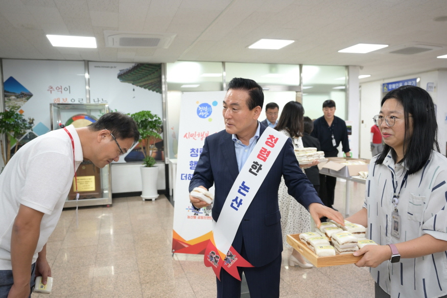 [ÃæÃ»ÇÖÀ̽´] ¹é¼ºÇö ³í»ê½ÃÀåÀ» ºñ·ÔÇÑ ³í»ê½Ãû °£ºÎÁøÀÌ 26ÀÏ ¾ÆÄ§ º»Ã» Çö°ü¿¡¼ Ãâ±Ù ÁßÀÎ Á÷¿øµéÀ» Á÷Á¢ ¸ÂÀÌÇß´Ù.