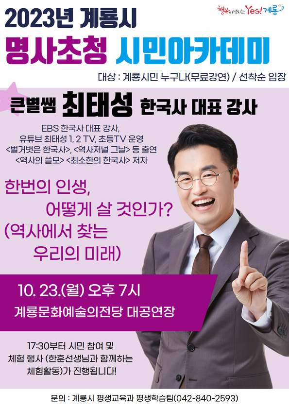 À̹ø Ư°¿¡´Â Çѱ¹»ç ÀÏŸ°»ç·Î ²ÅÈ÷´Â ¡®Å«º°½Ü¡¯ ÃÖżº °»ç¸¦ ÃÊûÇÏ¿© ¡®ÇÑ ¹øÀÇ Àλý, ¾î¶»°Ô »ì °ÍÀΰ¡¡¯¶ó´Â ÁÖÁ¦·Î °¿¬À» ÁøÇàÇÑ´Ù.
