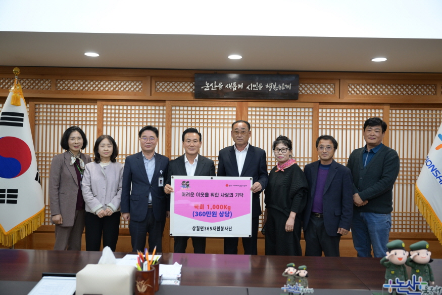 [ÃæÃ»ÇÖÀ̽´] ³í»ê½Ã »ó¿ù¸éÀ» Áß½ÉÀ¸·Î Áö¿ª»çȸ ³» ¾î·Á¿î ÀÌ¿ô µ½±â ¹× ºÀ»çȰµ¿¿¡ Èû¾²°í ÀÖ´Â ¡®»ó¿ù¸é365ÀÚ¿øºÀ»ç´Ü¡¯(´ÜÀå ÃÖÈ£°æ)ÀÌ Áö³ 15ÀÏ ³í»ê½ÃûÀ» ã¾Æ »ç¶ûÀÇ ½Ò 1,000kg(360¸¸ ¿ø »ó´ç)À» ±âŹÇß´Ù.