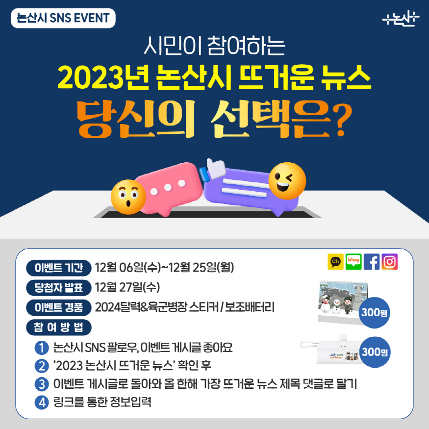 Âü¿© ¹æ¹ýÀº °£´ÜÇÏ´Ù. ³í»ê½Ã ºí·Î±×(https://blog.naver.com/nscity)·Î Á¢¼ÓÇØ ¡®2023 ³í»ê½Ã°¡ ¾Ë·Áµå¸®´Â ¿ùº° 10´ë ´º½º¡¯¸¦ Ŭ¸¯ÇÑ ÈÄ Èĺ¸ ¸®½ºÆ® Áß¿¡¼ º»ÀÎÀÌ »ý°¢ÇÏ´Â °¡Àå ¶ß°Å¿î ¼Ò½ÄÀ» ´ñ±Û·Î ³²±â¸é µÈ´Ù. È帴 ³í»ê½Ãû È«º¸Çù·Â½Ç¿¡¼ ¸Å´Þ ¼±Á¤ÇÑ ÁÖ¿ä ¼Ò½Ä(1¿ùºÎÅÍ 11¿ù±îÁö)À¸·Î ±¸¼ºµÆ´Ù.