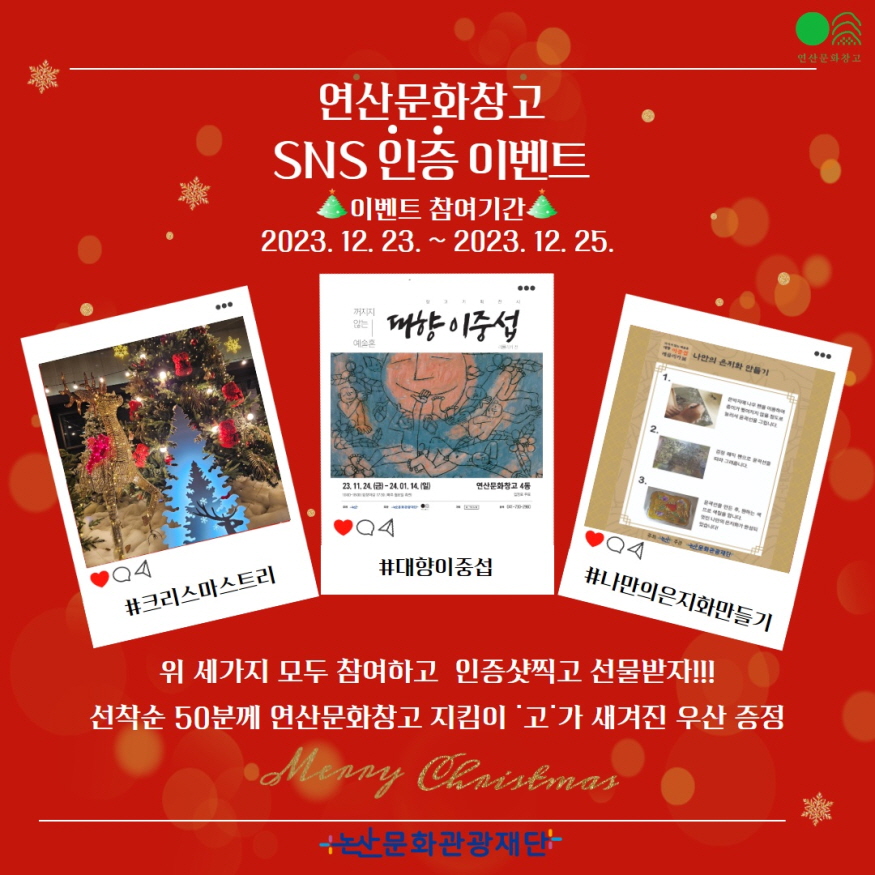 [ÃæÃ»ÇÖÀ̽´] ³í»ê¹®È­°ü±¤Àç´Ü(´ëÇ¥ÀÌ»ç ÁöÁøÈ£, ÀÌÇÏ Àç´Ü)ÀÌ ¿À´Â 23ÀϺÎÅÍ 25ÀϱîÁö ¿¬»ê¹®È­Ã¢°í¿¡¼­ Ưº°ÇÑ Å©¸®½º¸¶½º À̺¥Æ®¸¦ °³ÃÖÇÑ´Ù.