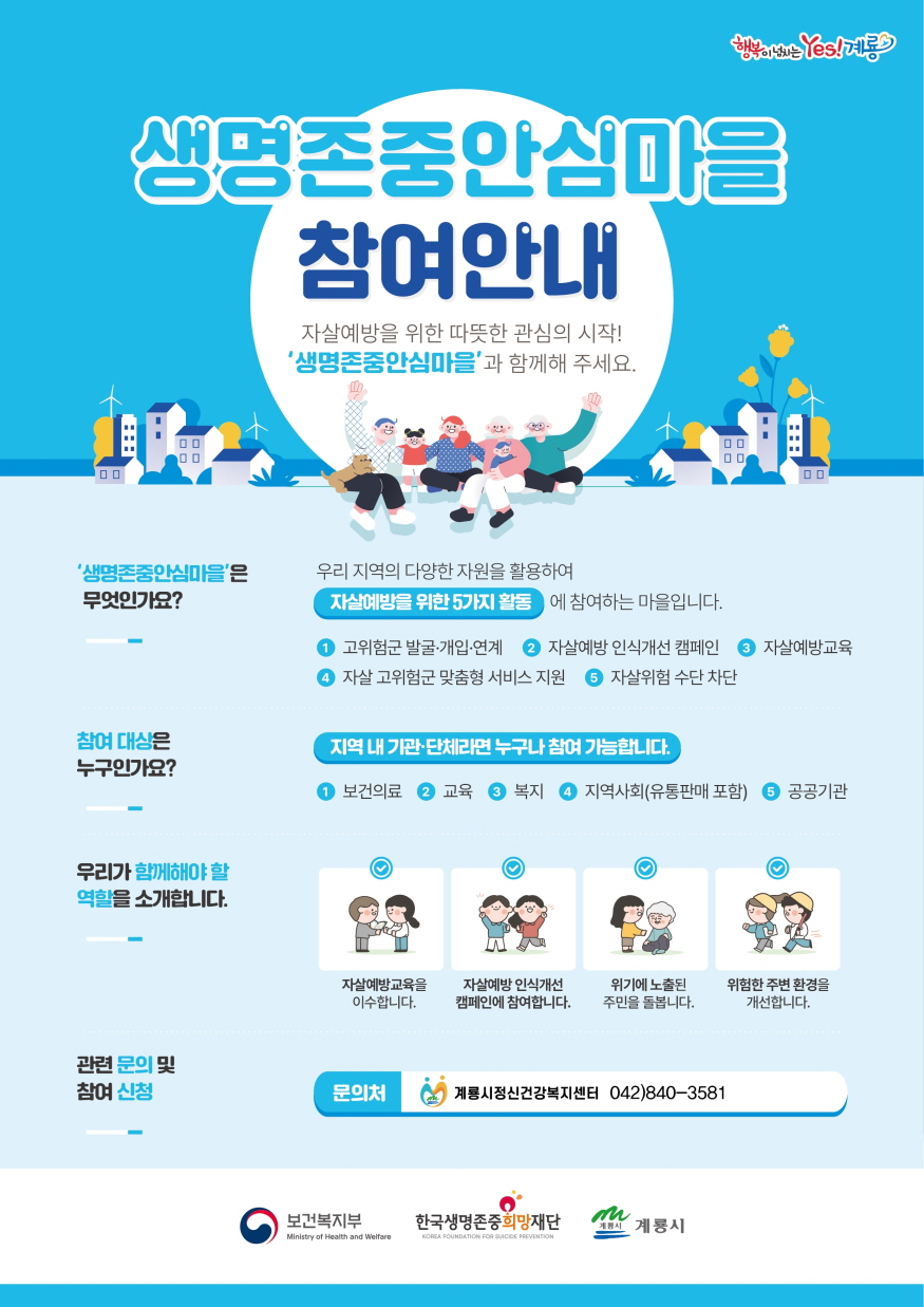 [ÃæÃ»ÇÖÀ̽´=ÀÌÈÁø ±âÀÚ] °è·æ½Ã(½ÃÀå ÀÌÀÀ¿ì)´Â ÀÚ»ì ¿¹¹æ°ú »ý¸íÁ¸Áß ¹®È È®»êÀ» À§ÇØ ÀÌ´ÞºÎÅÍ Áö¿ª ³» 13°³ ±â°ü°ú ÇÔ²² ¡®»ý¸íÁ¸Áß ¾È½É¸¶À»¡¯ Á¶¼º »ç¾÷À» º»°Ý ÃßÁøÇÑ´Ù.