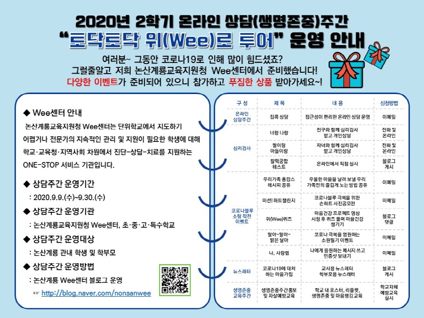 ƯÈ÷ À̹ø ¿Â¶óÀÎ »ó´ãÁÖ°£Àº ³í»ê°è·æ±³À°Áö¿øÃ» Wee¼¾ÅÍ ºí·Î±×¸¦ Ȱ¿ëÇÏ¿© ¿î¿µµÇ¸ç, ³í»ê½Ãû°ú Çù·ÂÇÏ¿© °ü³» ¹®ÀÚÀü±¤ÆÇ ¹× SNS(ºí·Î±×)¸¦ ÅëÇØ È«º¸ÇÏ¿© Âü¿©¸¦ À¯µµÇÒ °èȹÀÌ´Ù.