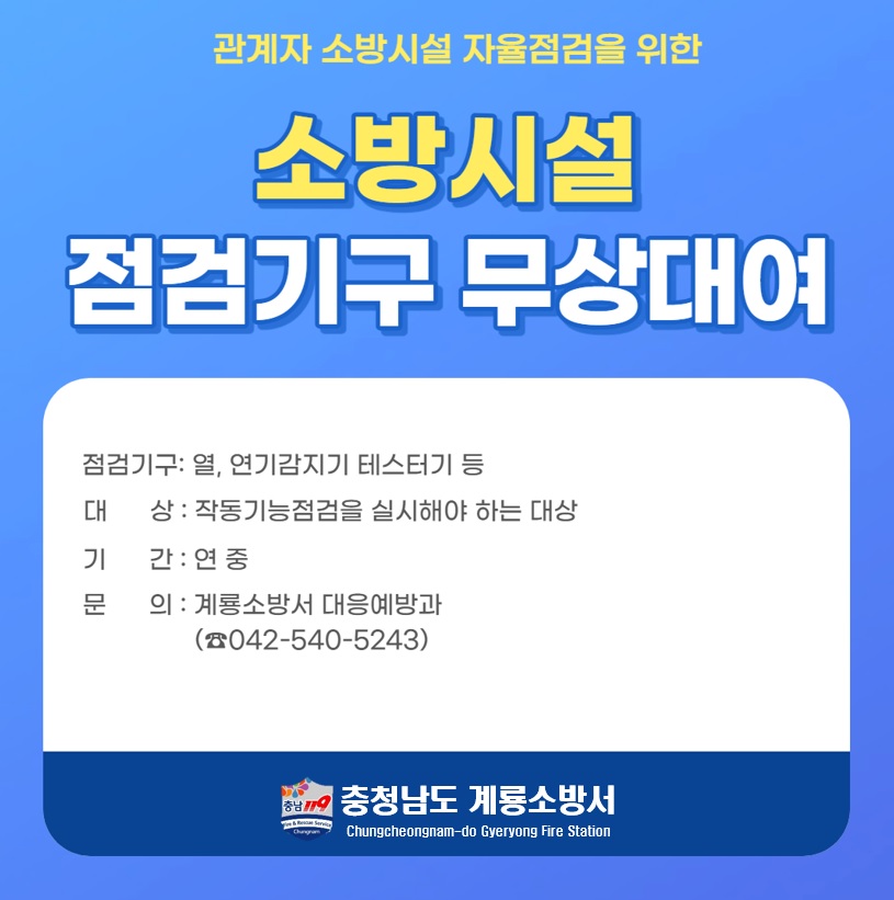 [ÃæÃ»ÇÖÀ̽´] °è·æ¼Ò¹æ¼­´Â ¼Ò¹æ´ë»ó¹° °ü°èÀÎÀÇ ÀÚÀ²¾ÈÀü°ü¸® °­È­¸¦ À§ÇÑ ¡®¼Ò¹æ½Ã¼³ Á¡°Ë±â±¸ ¹«»ó ´ë¿© ¼­ºñ½º¡¯ ÀÌ¿ëÀ» È«º¸ÇÑ´Ù°í ¹àÇû´Ù.
