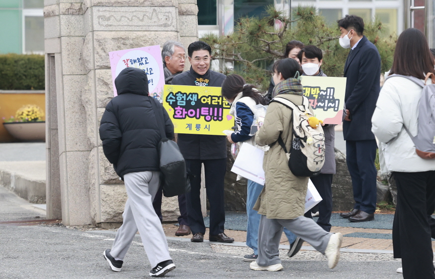 ÀÌÀÀ¿ì ½ÃÀå°ú ½Ã °øÁ÷ÀÚ´Â ¡®ÀßÇØ¿Ô°í ÀßÇϰí ÀÖ°í ÀßÇҰžß!¡¯, ¡®´«ºÎ½Ã°Ô ºû³ª´Â ³ÊÀÇ ³»ÀÏÀ» ÀÀ¿øÇØ¡¯ µîÀÇ ¹®±¸°¡ ÀûÈù ÀÀ¿ø ÇÇÄÏÀ» µé°í ½ÃÇèÀåÀ¸·Î µé¾î¼­´Â ¼öÇè»ýµéÀÌ ±äÀåÀ» ´ú°í ±×µ¿¾È °¥°í ´ÛÀº ½Ç·ÂÀ» ¸¶À½²¯ ¹ßÈÖÇϱæ ÀÀ¿øÇß´Ù.
