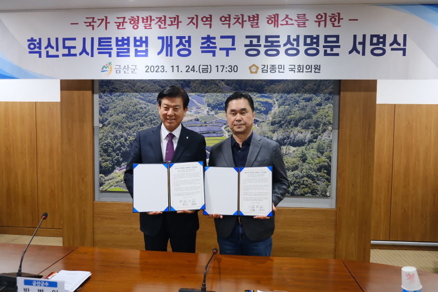 [ÃæÃ»ÇÖÀ̽´] ±èÁ¾¹Î ±¹È¸ÀÇ¿ø(Ãæ³² ³í»ê‧°è·æ‧±Ý»ê)°ú ¹Ú¹üÀÎ ±Ý»ê±º¼ö´Â 24ÀÏ ±Ý»ê±ºÃ»¿¡¼­ ±¹°¡ ±ÕÇü¹ßÀü°ú Áö¿ª ¿ªÂ÷º° ÇØ¼Ò¸¦ À§ÇÑ ¡¸Çõ½Åµµ½Ã Á¶¼º ¹× ¹ßÀü¿¡ °üÇÑ Æ¯º°¹ý(ÀÌÇÏ Çõ½Åµµ½ÃƯº°¹ý)¡¹ °³Á¤À» Ã˱¸ÇÏ´Â °øµ¿¼º¸í¹®À» ¹ßÇ¥Çß´Ù.