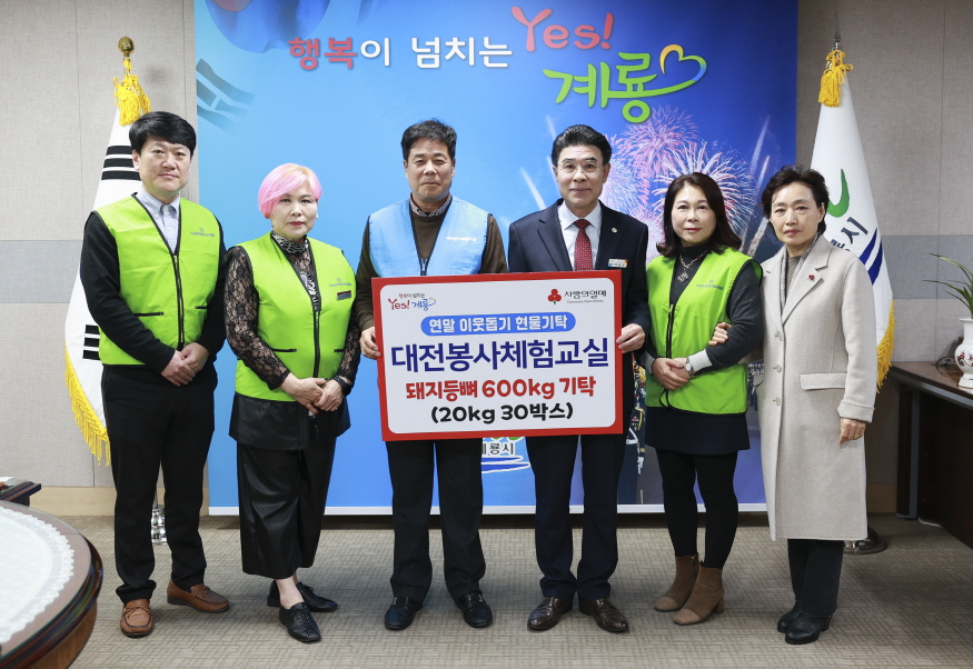 [ÃæÃ»ÇÖÀ̽´] °è·æ½Ã(½ÃÀå ÀÌÀÀ¿ì)´Â Áö³­ 14ÀÏ ´ëÀüºÀ»çüÇè±³½Ç(ȸÀå ±ÇÈïÁÖ)·ÎºÎÅÍ µÅÁöµî»À 600kg(20kg 30¹Ú½º)À» ±âŹ¹Þ¾Ò´Ù°í ¹àÇû´Ù. ÀÌÀÀ¿ì ½ÃÀåÀº ¡°ÀÌ¿ô»ç¶ûÀ» ½ÇÃµÇØ ÁֽŠ´ëÀüºÀ»çüÇè±³½Ç¿¡ °¨»çµå¸®¸ç, Áö¿øÇØ Áֽй°Ç°Àº ¼ÒÁßÈ÷ Àü´ÞÇϰڴ١±°í ¸»Çß´Ù. ½Ã´Â ±âŹ ¹ÞÀº ¹°Ç°À» °ü³» »çȸº¹Áö½Ã¼³ 7°³¼Ò¿¡ ¹èºÎÇÒ ¿¹Á¤ÀÌ´Ù.