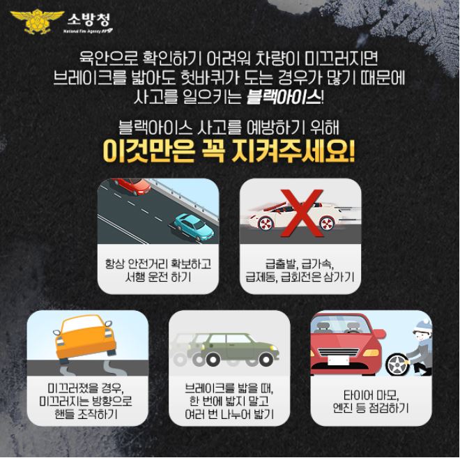 [ÃæÃ»ÇÖÀ̽´] °è·æ¼Ò¹æ¼(¼Àå ±è³²¼®)´Â ÃÖ±Ù °Ü¿ïö 'ºí·¢¾ÆÀ̽º((Black ice¡¤µµ·Î °áºù Çö»ó)'·Î ÀÎÇÑ ±³Åë»ç°í°¡ Áõ°¡ÇÔ¿¡ µû¶ó °¢º°ÇÑ ÁÖÀǸ¦ ´çºÎÇÑ´Ù°í 4ÀÏ ¹àÇû´Ù.