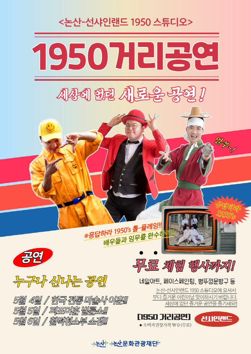 ³í»ê½Ã ÁÖÃÖ, (Àç)³í»ê¹®È­°ü±¤Àç´Ü ÁÖ°üÀ¸·Î ÁøÇàµÇ´Â À̹ø °ø¿¬Àº °ú°Å·ÎÀÇ Ã߾←Çà°ú ¿ª»çÀÇ ÇöÀåÀ» ´À³¥ ¼ö ÀÖ´Â 1950½ºÆ©µð¿À¿¡¼­ ´Ü¼øÈ÷ ´«À¸·Î º¸´Â °ü¶÷¿¡¼­ ¹þ¾î³ª °¡Á·, ¿¬ÀÎ, Ä£±¸µé°ú ÇÔ²² Áñ±æ ¼ö ÀÖ´Â Âü¿©Çü °ø¿¬°ú ¾î¸°À̳¯À» ¸Â¾Æ ÆäÀ̽ºÆäÀÎÆÃ, ³×ÀÏ¾ÆÆ®, º´¶Ñ²±¹®¹æ±¸(¾÷»çÀÌŬ¸µ üÇè) µî ´Ùä·Î¿î üÇèÇÁ·Î±×·¥À» ¹«·á·Î ÁøÇàÇϸç, ¹æ¹®°´µé¿¡°Ô dz¼ºÇÑ º¼°Å¸®¸¦ Á¦°øÇÑ´Ù°í ÇÑ´Ù.