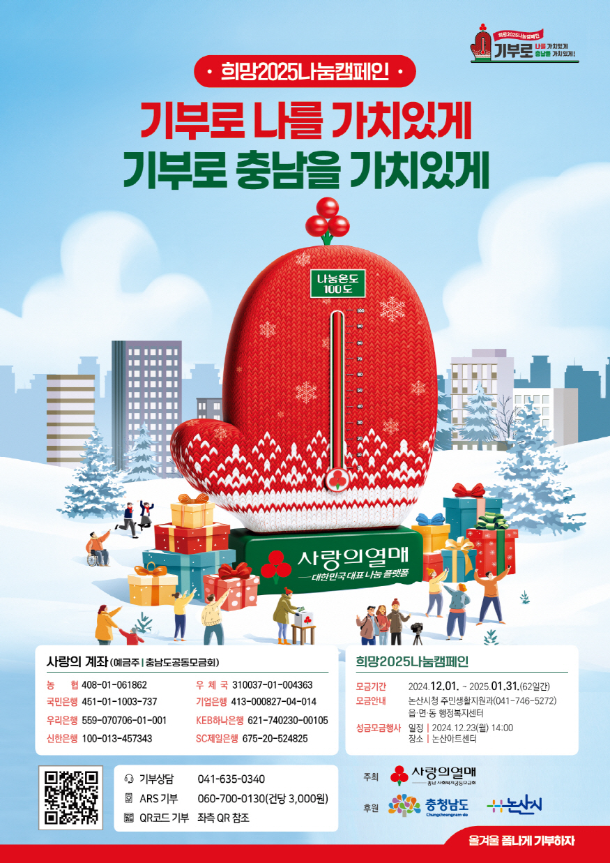 ¡®±âºÎ·Î ³ª¸¦ °¡Ä¡ÀÖ°Ô, ±âºÎ·Î ³í»êÀ» °¡Ä¡ÀÖ°Ô¡¯¶ó´Â ½½·Î°ÇÀ¸·Î ÁøÇàµÇ´Â Èñ¸Á2025 ³ª´®Ä·ÆäÀÎÀº ¿À´Â 2025³â 1¿ù 31ÀϱîÁö 62ÀÏ °£ ¼º±Ý ¸ð±ÝÀÌ ÁøÇàµÇ¸ç, 12¿ù 23ÀÏ ¿ÀÈÄ 2½Ã¿¡´Â ³í»ê½Ã ¾ÆÆ®¼¾ÅÍ¿¡¼­ ÁýÁß ¸ð±Ý Çà»ç¸¦ °¡Áú ¿¹Á¤ÀÌ´Ù.