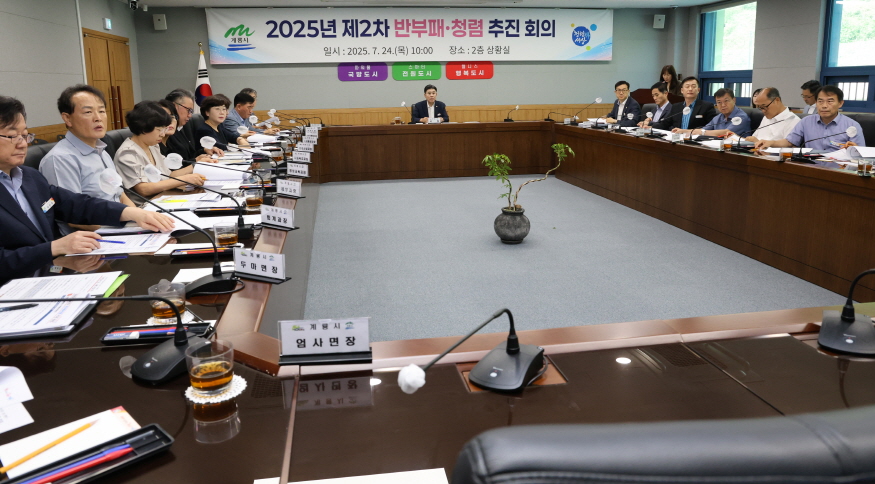 [ÃæÃ»ÇÖÀ̽´=ÀÌÈ­Áø ±âÀÚ] °è·æ½Ã(½ÃÀå ÀÌÀÀ¿ì)´Â 24ÀÏ ½Ãû »óȲ½Ç¿¡¼­ 2025³â Á¦2Â÷ ¹ÝºÎÆÐ¡¤Ã»·Å ÃßÁø ȸÀǸ¦ °³ÃÖÇϰí û·Åµµ Çâ»ó ¹× ºÎÆÐÃë¾àºÐ¾ß °³¼±¿¡ ´ëÇÑ °­·ÂÇÑ ÀÇÁö¸¦ Ç¥¸íÇß´Ù.