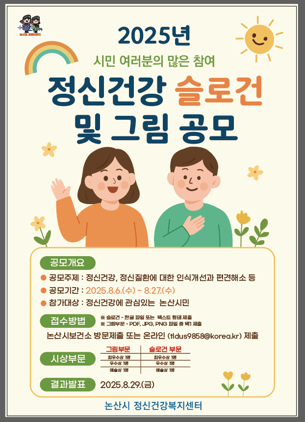 [ÃæÃ»ÇÖÀ̽´=ÀÌÈ­Áø ±âÀÚ] ³í»ê½Ã(½ÃÀå ¹é¼ºÇö)´Â Á¤½Å°Ç°­¿¡ ´ëÇÑ ½Ã¹ÎµéÀÇ °ü½ÉÀ» Á¦°íÇϰí, Á¤½ÅÁúȯ¿¡ ´ëÇÑ ºÎÁ¤Àû ÀνÄÀ» °³¼±Çϱâ À§ÇØ ¡®2025³â Á¤½Å°Ç°­ ½½·Î°Ç ¹× ±×¸² °ø¸ðÀü¡¯À» ¿À´Â 8¿ù 27ÀϱîÁö °³ÃÖÇÑ´Ù.