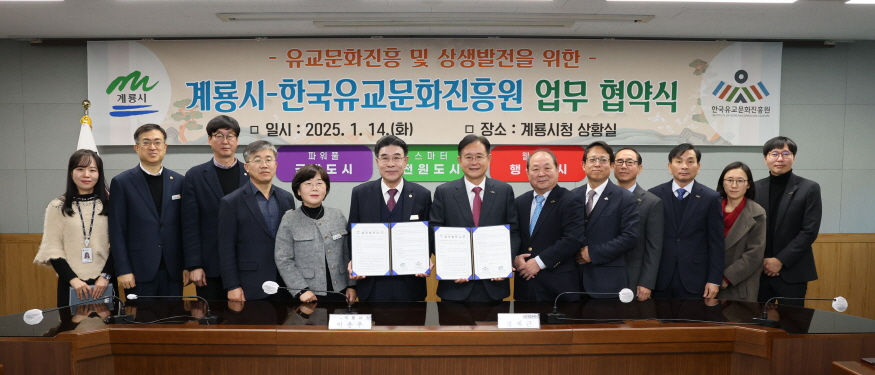 [ÃæÃ»ÇÖÀ̽´] °è·æ½Ã(½ÃÀå ÀÌÀÀ¿ì)´Â 14ÀÏ ½Ãû »óȲ½Ç¿¡¼ À¯±³¹®ÈÁøÈï ¹× »ó»ý¹ßÀüÀ» À§ÇØ Çѱ¹À¯±³¹®ÈÁøÈï¿ø(¿øÀå Á¤Àç±Ù, ÀÌÇÏ ÇÑÀ¯Áø)°ú ¾÷¹«Çù¾à(MOU)À» ü°áÇß´Ù°í ¹àÇû´Ù.