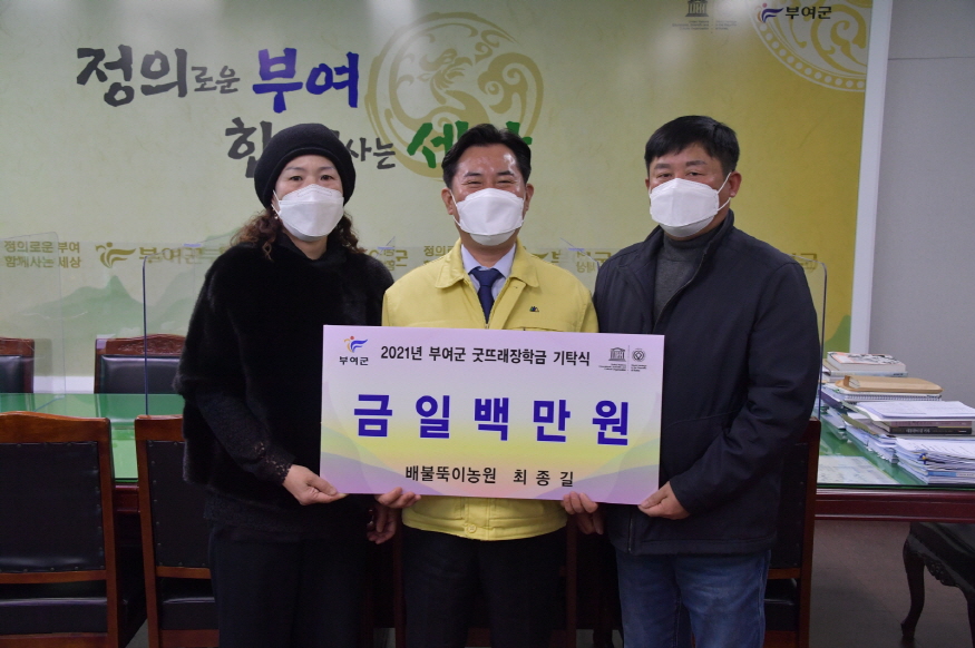 [ÃæÃ»ÇÖÀ̽´] ¹èºÒ¶ÒÀÌ³ó¿ø ÃÖÁ¾±æ ´ëÇ¥°¡ Áö³­ 23ÀÏ ºÎ¿©±ºÃ»À» ¹æ¹®ÇØ Áö¿ªÀÎÀç À°¼ºÀ» À§ÇÑ ÀåÇÐ±Ý 100¸¸¿øÀ» (Àç)ºÎ¿©±º±Â¶ß·¡ÀåÇÐȸ¿¡ ±âŹÇß´Ù.