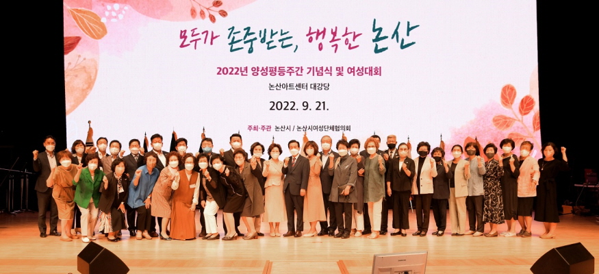[ÃæÃ»ÇÖÀ̽´] ³í»ê½Ã(½ÃÀå ¹é¼ºÇö)¿Í ³í»ê½Ã¿©¼º´ÜüÇùÀÇȸ(ȸÀå ±èÇýÁß)°¡ 21ÀÏ ³í»ê¾ÆÆ®¼¾ÅÍ ´ë°ø¿¬Àå¿¡¼ ¡®2022³â ¾ç¼ºÆòµîÁÖ°£ ±â³ä½Ä ¹× ¿©¼º´ëȸ¡¯¸¦ ¿°í, ¾ç¼ºÆòµî »çȸ ½ÇÇöÀ» À§ÇÑ ÈÇÕ°ú ¼ÒÅëÀÇ ½Ã°£À» °¡Á³´Ù.