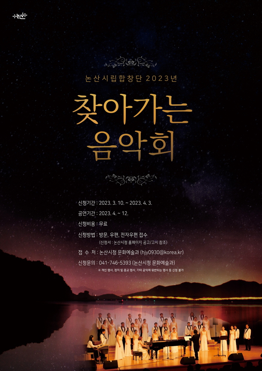 [ÃæÃ»ÇÖÀ̽´] ³í»ê½Ã(½ÃÀå ¹é¼ºÇö)°¡ ½Ã¹Î¿¡°Ô ´Ùä·Î¿î ¹®È ÇâÀ¯ÀÇ ±âȸ¸¦ Á¦°øÇϰíÀÚ ¡®2023³â ã¾Æ°¡´Â À½¾Çȸ¡¯¸¦ ±âȹÇϰí, ÇÔ²² °ø¿¬ ¹«´ë¸¦ ²Ù¹Ð ±â°üÀ» ¸ðÁýÇÑ´Ù.