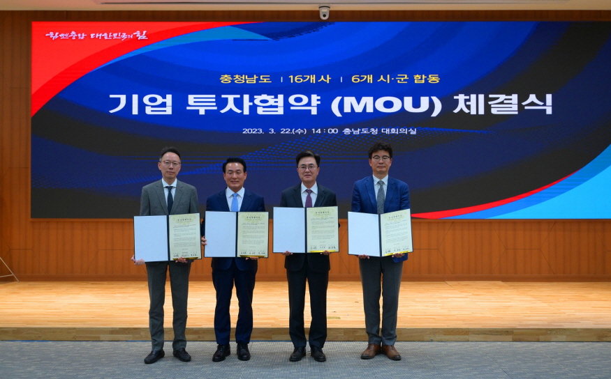 ÇÑÆí, À̳¯ ÀÌ·ïÁø ÇÕµ¿ ÅõÀÚÇù¾à ü°á½Ä¿¡´Â Ãæ³²µµ ³» 6°³ ½Ã±º ¹× 16°³ ±â¾÷´ëÇ¥°¡ ÇÑ ÀÚ¸®¿¡ ¸ð¿© 3Á¶ 232¾ï ¿ø ±Ô¸ðÀÇ MOU¸¦ ü°áÇß´Ù. ±èÅÂÈì Ãæ³²µµÁö»ç´Â ¡°Ãæ³²¿¡ »Ñ¸®¸¦ ³»¸° ±â¾÷µéÀÌ ´õ Å©°Ô ¼ºÀåÇÒ ¼ö ÀÖµµ·Ï ±â¾÷Çϱâ ÁÁÀº Åä¾çÀ» ¸¸µé°Ú´Ù¡±°í ¹àÇû´Ù.