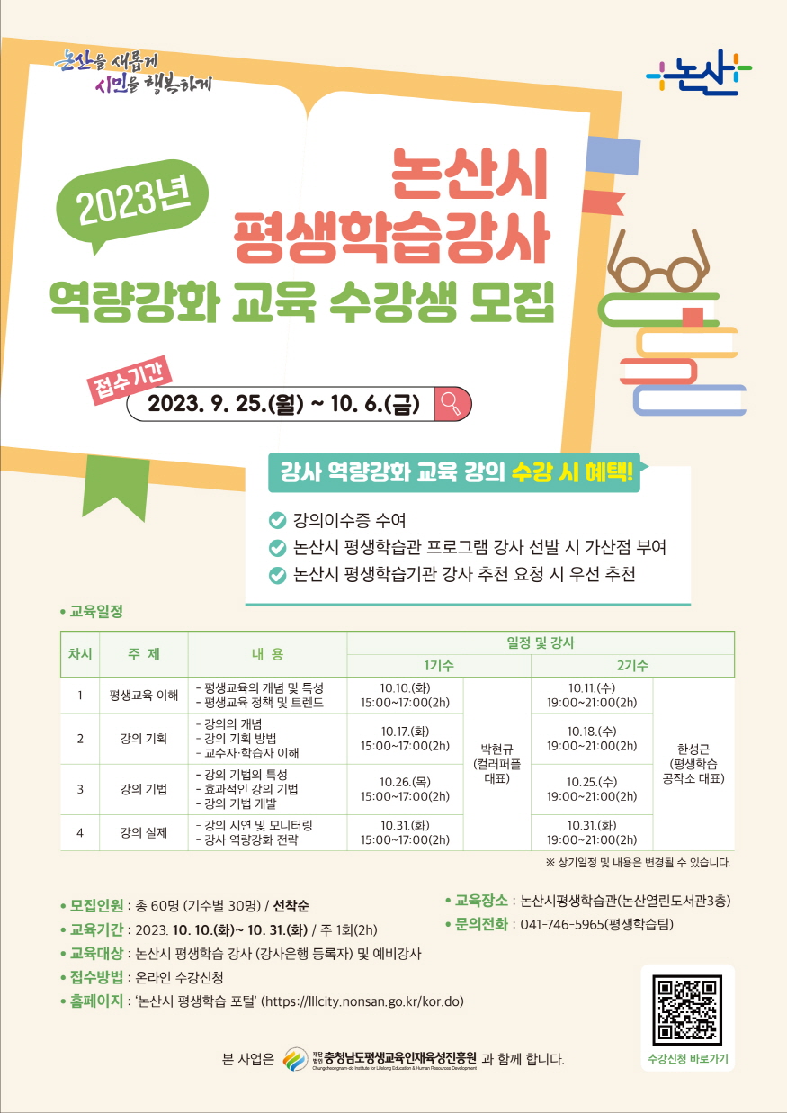 À̹ø ±³À°Àº ³í»ê½Ã¿Í ÃæÃ»³²µµÆò»ý±³À°ÀÎÀçÀ°¼ºÁøÈï¿øÀÌ °øµ¿ÁÖ°üÀ¸·Î ÀÌ·ïÁø´Ù. ±³À°°úÁ¤Àº ¡âÆò»ýÇнÀÀÇ ÀÌÇØ ¡â°ÀÇ ±âȹ ¡â°ÀÇ ±â¹ý ¡â°ÀÇ ½ÇÁ¦ µî ÃÑ 4°³ °Á·Π±¸¼ºµÇ¸ç, ¿À´Â 10¿ù 10ÀϺÎÅÍ 10¿ù ¸»±îÁö 4ÁÖ°£ ÁøÇàµÈ´Ù.