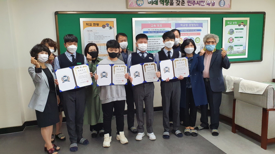 [ÃæÃ»ÇÖÀ̽´] ¾ö»çÁßÇб³(±³Àå ±è¿ì¿µ)´Â 10¿ù 7ÀÏ(¼ö) ±³Àå½Ç¿¡¼­ ²Þ³ª¹«ÀåÇÐȸ(ȸÀå À¯¹ÌÀÚ)¿Í ¾÷¹«Çù¾àÀ» ü°áÇϰí, ÀåÇлýÀ¸·Î ¼±¹ßµÈ 4¸íÀÇ Çлýµé¿¡°Ô ÀåÇÐÁõ¼­¸¦ Àü´ÞÇÏ¿´´Ù°í ¹àÇû´Ù.