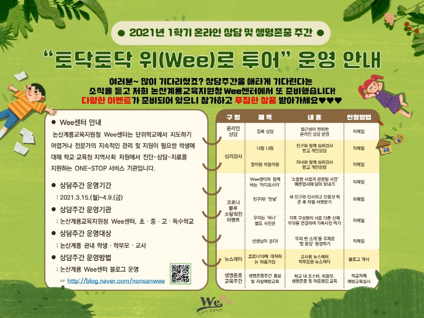Æ¯È÷ À̹ø ¿Â¶óÀÎ »ó´ã ¹× »ý¸íÁ¸Áß ÁÖ°£Àº ³í»ê°è·æ±³À°Áö¿øÃ» Wee¼¾ÅÍ ºí·Î±×¸¦ È°¿ëÇÏ¿© ¿î¿µµÈ´Ù. ¶ÇÇÑ ³í»ê½Ãû°ú Çù·ÂÇÏ¿© ¹®ÀÚ Àü±¤ÆÇ, ȨÆäÀÌÁö, ºí·Î±×¸¦ ÅëÇØ È«º¸ÇÏ¿© °ü³» Çлý‧Çкθð‧±³»çÀÇ Âü¿©¸¦ À¯µµÇÒ °èȹÀÌ´Ù.