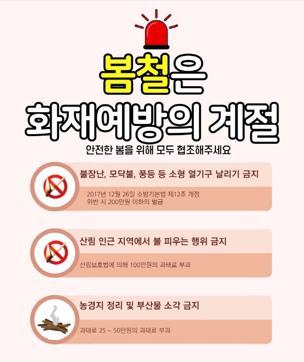È­Àç°¡ ¹ß»ýÇßÀ» ½Ã ½Å°íº¸´Ù Çdz­À» ¿ì¼±À¸·Î ÇÏ¿©¾ß ÇÏ¸ç º½Ã¶Àº °èÀý Ư¼º»ó ÀÛÀº ºÒ¾¾·Îµµ ´ëÇü È­Àç°¡ ¹ß»ýÇÒ È®·üÀÌ ³ô±â ¶§¹®¿¡ ºÒÀå³­, ¸ð´ÚºÒ, dzµî µî ¼ÒÇü ¿­±â±¸ ³¯¸®±â µîÀ» ±ÝÁöÇÑ´Ù°í ¸»Çß´Ù.