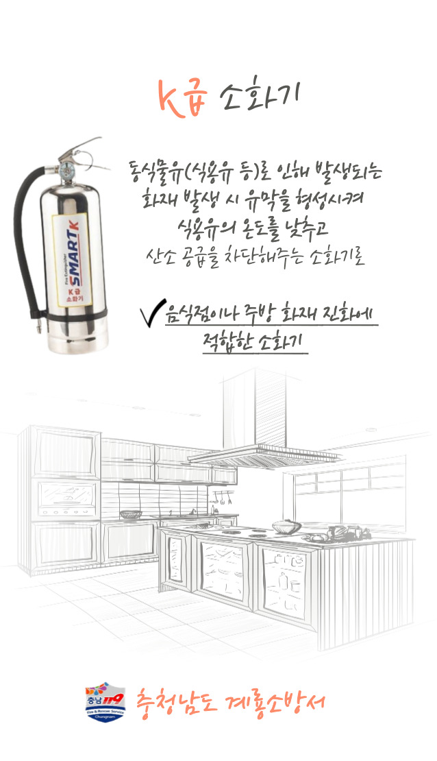 [ÃæÃ»ÇÖÀ̽´] °è·æ¼Ò¹æ¼­(¼­Àå ±è³²¼®)´Â Áֹ濡¼­ ¹ß»ýÇÏ´Â È­À縦 ¿¹¹æÇϱâ À§ÇØ ½Ä¿ëÀ¯ È­Àç¿¡ ÀûÀÀ¼ºÀÌ ¿ì¼öÇÑ ¡®K±Þ ¼ÒÈ­±â¡¯¸¦ ºñÄ¡ÇØ ÁÖ±æ ´çºÎÇÑ´Ù°í 16ÀÏ ¹àÇû´Ù.