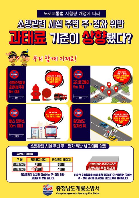 ¼ÒÈÀü ÁÖº¯ 5mÀ̳»´Â ¡®ÁֹνŰíÁ¦ 4´ë ´Ü¼Ó´ë»ó¡¯ Áß Çϳª·Î µµ·Î±³Åë¹ý 32Á¶¿¡ µû¶ó ¼Ò¹æ¿ë¼ö½Ã¼³ ¶Ç´Â ºñ»ó¼ÒÈÀåÄ¡°¡ ¼³Ä¡µÈ Àå¼Ò·ÎºÎÅÍ 5mÀ̳» Â÷·®À» ÁÖ¡¤Á¤Â÷ÇÏÁö ¸øÇϵµ·Ï ±ÔÁ¤ÇßÀ¸¸ç, À§¹Ý ½Ã ½Â¿ëÀÚµ¿Â÷´Â 4¸¸¿ø, ½ÂÇÕÀÚµ¿Â÷´Â 5¸¸¿øÀÇ °úÅ·ᰡ ºÎ°úµÈ´Ù.