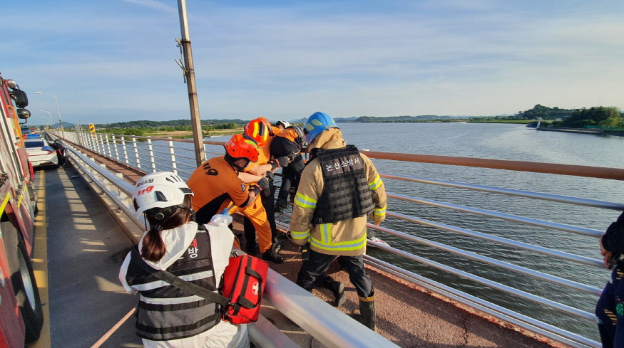 ¾ðÁ¦ ³­°£ ¾Æ·¡·Î ¶³¾îÁúÁö ¸ð¸£´Â ¸Å¿ì ±ä¹ÚÇÑ »óȲÀ¸·Î ¹Î°£ ¼ö³­±¸Á¶´ë´Â 119±¸Á¶´ë¿ø°ú Çù·ÂÇÏ¿© Ȳ»ê´ë±³ ¾Æ·¡ º¸Æ®¸¦ ´ë±âÇØ Ãß¶ô¿¡ ´ëºñÇÏ¿´°í, ´Ù¸¥ ¼Ò¹æ´ë¿øÀº ½Å¼ÓÈ÷ ·ÎÇÁ¸¦ ÀÌ¿ëÇØ ¾ÈÀü È®º¸ ÈÄ ³²¼ºÀ» ¹«»çÈ÷ ±¸Á¶Çß´Ù.
