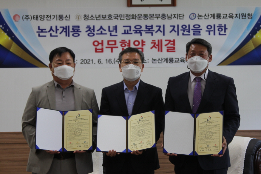 [ÃæÃ»ÇÖÀ̽´] ³í»ê°è·æ±³À°Áö¿øÃ»(±³À°Àå ÀÌÁø±¸)Àº ¢ßžçÀü±âÅë½Å(´ëÇ¥ ÀÌÁ¤È£), û¼Ò³âº¸È£±¹¹ÎÁ¤È­¿îµ¿º»ºÎÃæ³²Áö´Ü(´ÜÀå À̼º±Ô)°ú °øµ¿À¸·Î 2021³â 6¿ù 16ÀÏ(¼ö) ³í»ê°è·æ±³À°Áö¿øÃ»¿¡¼­ ¡®³í»ê°è·æ û¼Ò³â ±³À°º¹Áö Áö¿ø¡¯À» À§ÇÑ 3ÀÚ ¾÷¹« Çù¾à(MOU)À» ü°áÇÏ¿´´Ù.