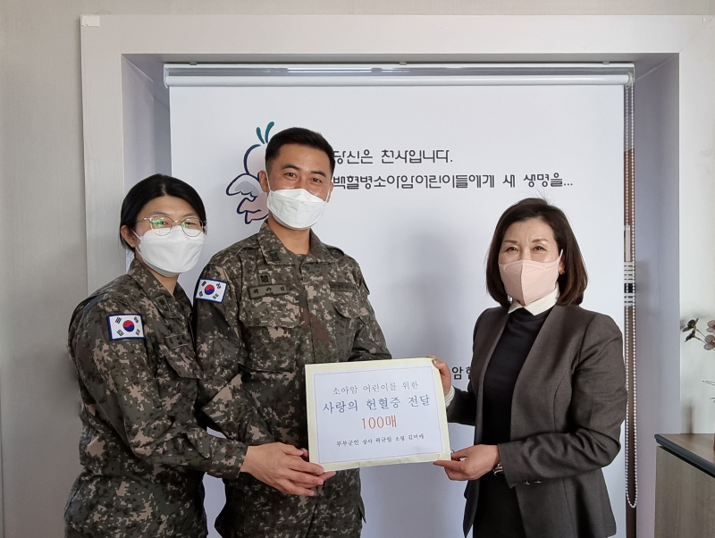 [ÃæÃ»ÇÖÀ̽´] À°±ºÈÆ·Ã¼Ò °û±ÔÀÏ »ó»ç°¡ ¹éÇ÷º´ ¼Ò¾Æ¾Ï ȯ¿ìµéÀ» µ½±â À§ÇØ Áö³ 10³â µ¿¾È ¸ðÀº ÇåÇ÷Áõ 100ÀåÀ» ±âºÎÇß´Ù.