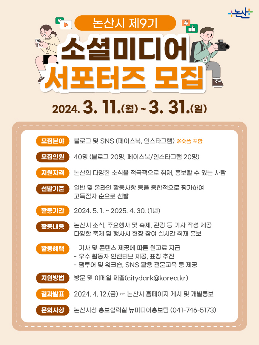 [ÃæÃ»ÇÖÀ̽´] ³í»ê½Ã(½ÃÀå ¹é¼ºÇö)°¡ ¿À´Â 31ÀϱîÁö ºí·Î±×¤ýÆäÀ̽ººÏ¤ýÀνºÅ¸±×·¥¿¡¼­ ¡®»çÀ̹ö È«º¸´ë»ç¡¯¿ªÇÒÀ» ¼öÇàÇÒ Á¦9±â ¼Ò¼È¹Ìµð¾î ¼­Æ÷ÅÍÁî 40¸íÀ» ¸ðÁýÇÑ´Ù.