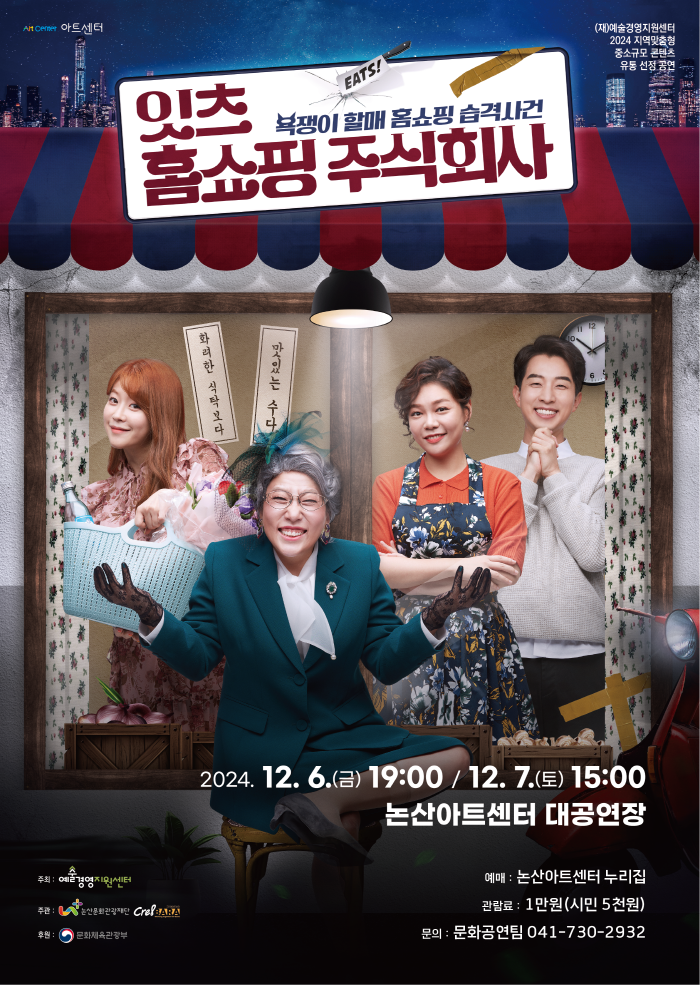 [ÃæÃ»ÇÖÀ̽´] (Àç)³í»ê¹®È­°ü±¤Àç´Ü(ÀÌ»çÀå ¹é¼ºÇö)Àº ¿À´Â 12¿ù 6ÀÏ(±Ý) 19½Ã¿Í 7ÀÏ(Åä) 15½Ã ¾çÀϰ£ ³í»ê¾ÆÆ®¼¾ÅÍ ´ë°ø¿¬Àå¿¡¼­ ¿¬±Ø <ÀÕÃ÷ Ȩ¼îÇÎ ÁÖ½Äȸ»ç> °ø¿¬À» ÁøÇàÇÑ´Ù°í ¹àÇû´Ù.