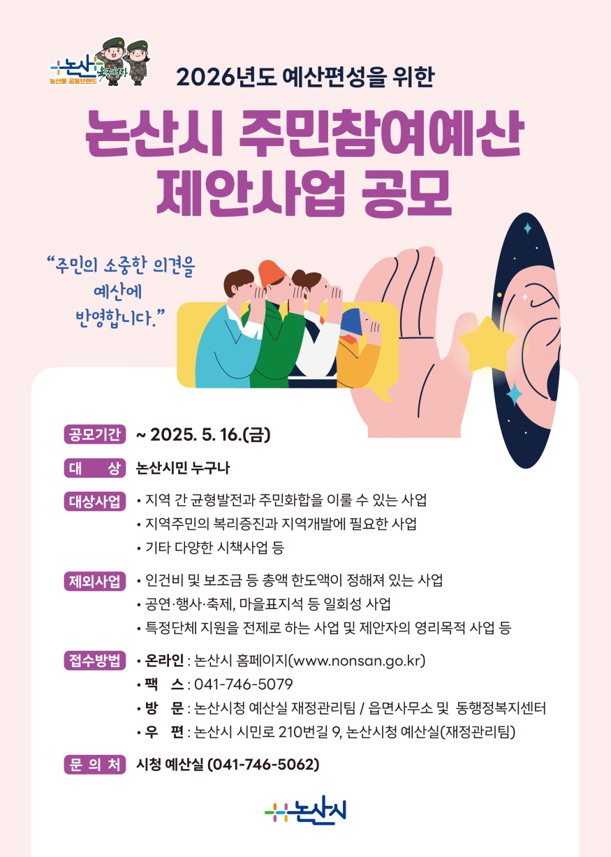 [ÃæÃ»ÇÖÀ̽´] ³í»ê½Ã(½ÃÀå ¹é¼ºÇö)´Â ¿À´Â 5¿ù 16ÀϱîÁö ¡®2026³âµµ ¿¹»êÆí¼ºÀ» À§ÇÑ ÁÖ¹ÎÂü¿©¿¹»ê Á¦¾È»ç¾÷ °ø¸ð¡¯¸¦ ÁøÇàÇÑ´Ù.