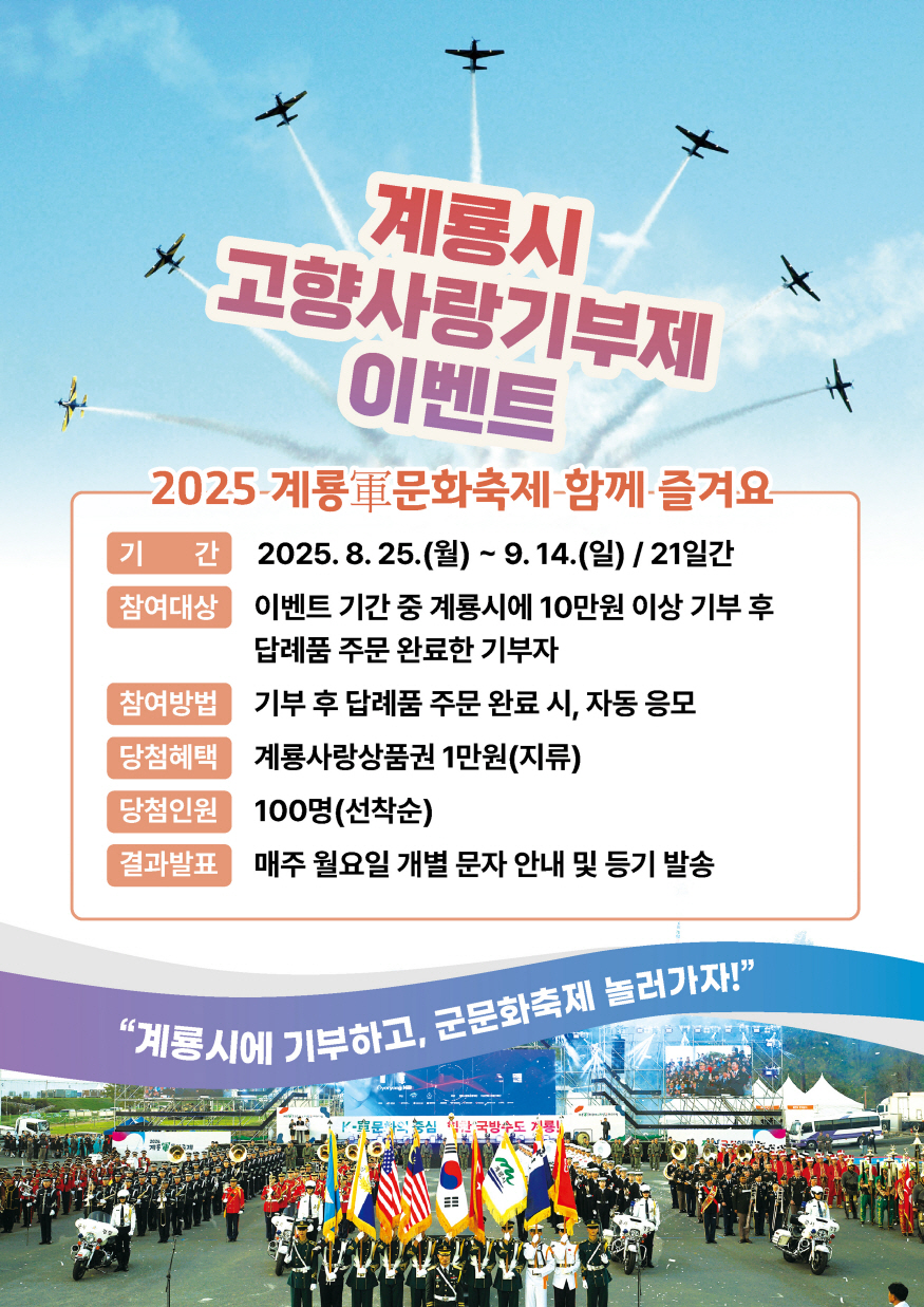 ÇÑÆí, °è·æ½Ã´Â ¿À´Â 9¿ù 17ÀϺÎÅÍ 21ÀϱîÁö ¿­¸®´Â 2025 °è·æÏÚ¹®È­ÃàÁ¦ ±â°£ Áß¿¡µµ °íÇâ»ç¶û±âºÎÁ¦ È«º¸ ºÎ½º¸¦ ¿î¿µÇÏ¿© ÇöÀå ±âºÎÀÚ¸¦ ´ë»óÀ¸·Î ´Ù¾çÇÑ Âü¿© À̺¥Æ®¸¦ ÆîÄ¥ °èȹÀÌ´Ù.
