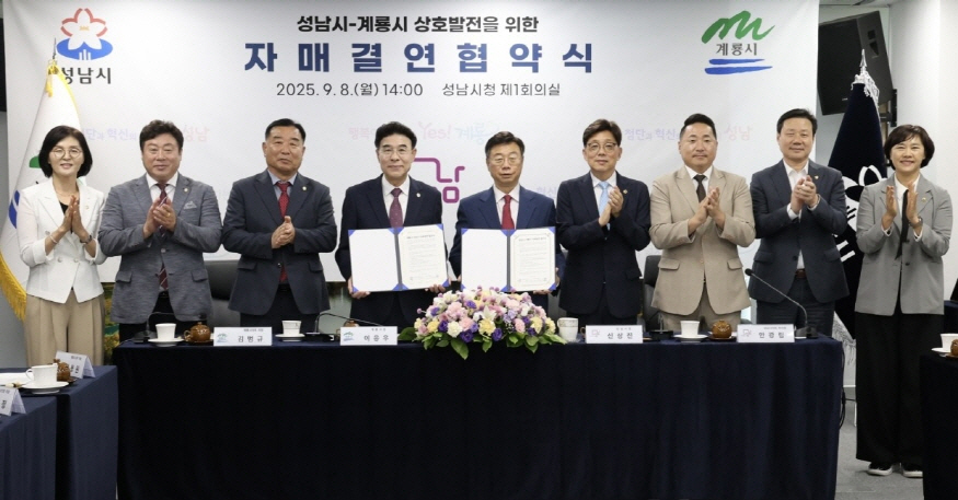 [ÃæÃ»ÇÖÀ̽´] °è·æ½Ã(½ÃÀå ÀÌÀÀ¿ì)¿Í °æ±âµµ ¼º³²½Ã(½ÃÀå ½Å»óÁø)°¡ 8ÀÏ ¼º³²½Ãû¿¡¼ ¿ìÈ£ ±³·ù ÁõÁø°ú »óÈ£ ¹ßÀü ÀڸŰῬ Çù¾àÀ» ü°áÇß´Ù°í ¹àÇû´Ù.
