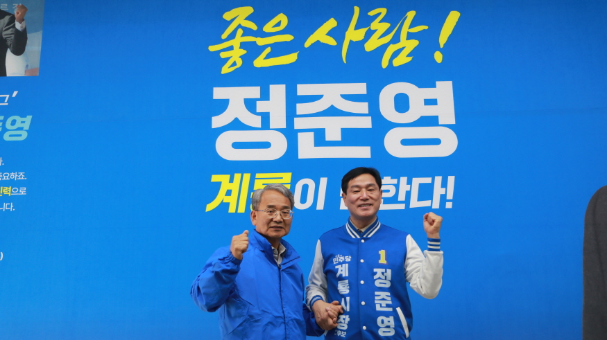 [ÃæÃ»ÇÖÀ̽´] ´õºÒ¾î¹ÎÁÖ´ç °è·æ½ÃÀå Èĺ¸ °æ¼±ÀÌ °á¼± ±¹¸é¿¡ Á¢¾îµç °¡¿îµ¥, ¹ÚÃ῱ Àü ¿¹ºñÈ帰¡ Á¤ÁØ¿µ ¿¹ºñÈĺ¸¿¡ ´ëÇÑ °ø½Ä ÁöÁö¸¦ ¼±¾ðÇÏ¸ç °øµ¿ ¼±°Å´ëÃ¥º»ºÎÀåÁ÷À» ¸Ã±â·Î Çß´Ù.